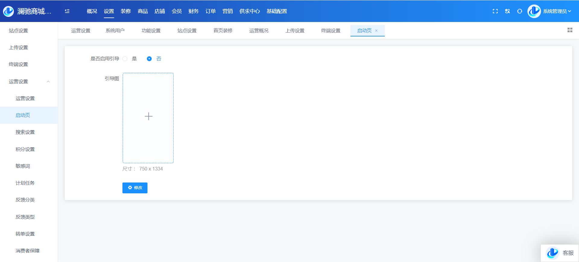 目录 搜索 展开 系统角色说明一、平台管理后台概况设置站点设置上传设置终端设置运营设置运营设置启动页搜索设置积分设置敏感词计划任务反馈分类反馈类型转单设置消费者保障服务财务设置提现设置支付渠道推广设置物流设置快递公司物流查询接口设置互联登录地区设置通知设置消息设置邮件设置短信设置APP推送社交设置IM设置直播设置城市分站微信设置微信设置回复设置菜单设置模板消息SEO设置装修PC装修首页装修页面导航分类导航手机装修首页装修首页导航商品商品管理分类管理品牌管理类型管理规格管理店铺店铺管理供应商管理店铺等级店铺分类入驻协议店铺评价会员会员管理积分管理会员等级注册协议表单数据升级日志用户渠道渠道数据财务会员资金线下支付收款确认订单明细提现管理充值卡管理交易流水-收支明细定额充值提现银行卡订单商品订单退款退货订单评价-店铺评价管理营销活动中心资讯中心分销中心社交种草App发布用户反馈首页弹窗供求中心采购大厅供应大厅基础设置系统用户角色管理安全设置操作日志二、商家管理后台首页订单商品营销资金报表店铺基础售后批发市场三、门店管理后台四、会员(买家)中心PC端个人中心移动端个人中心五、商户入驻流程商城前期准备资料域名备案指南支付宝收款账户开通及配置微信⽀付配置 暂无相关搜索结果! 阅读次数:35 本文档使用 MinDoc 发布 启动页 启动页设置是否启用引导并可以在此处添加引导图,打开移动端时展示作者:admin 创建时间:2024-08-20 13:05最后编辑:admin 更新时间:2025-12-10 15:34