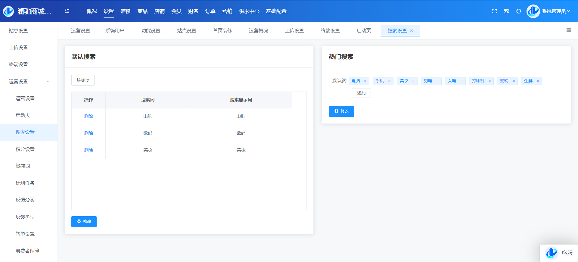 目录 搜索 展开 系统角色说明一、平台管理后台概况设置站点设置上传设置终端设置运营设置运营设置启动页搜索设置积分设置敏感词计划任务反馈分类反馈类型转单设置消费者保障服务财务设置提现设置支付渠道推广设置物流设置快递公司物流查询接口设置互联登录地区设置通知设置消息设置邮件设置短信设置APP推送社交设置IM设置直播设置城市分站微信设置微信设置回复设置菜单设置模板消息SEO设置装修PC装修首页装修页面导航分类导航手机装修首页装修首页导航商品商品管理分类管理品牌管理类型管理规格管理店铺店铺管理供应商管理店铺等级店铺分类入驻协议店铺评价会员会员管理积分管理会员等级注册协议表单数据升级日志用户渠道渠道数据财务会员资金线下支付收款确认订单明细提现管理充值卡管理交易流水-收支明细定额充值提现银行卡订单商品订单退款退货订单评价-店铺评价管理营销活动中心资讯中心分销中心社交种草App发布用户反馈首页弹窗供求中心采购大厅供应大厅基础设置系统用户角色管理安全设置操作日志二、商家管理后台首页订单商品营销资金报表店铺基础售后批发市场三、门店管理后台四、会员(买家)中心PC端个人中心移动端个人中心五、商户入驻流程商城前期准备资料域名备案指南支付宝收款账户开通及配置微信⽀付配置 暂无相关搜索结果! 阅读次数:33 本文档使用 MinDoc 发布 搜索设置 搜索设置设置默认搜索词和热门搜索词,每刷新一次页面,搜索框内默认搜索词都会变换PC展示:移动端展示:作者:admin 创建时间:2024-08-20 13:05最后编辑:admin 更新时间:2025-12-10 15:34