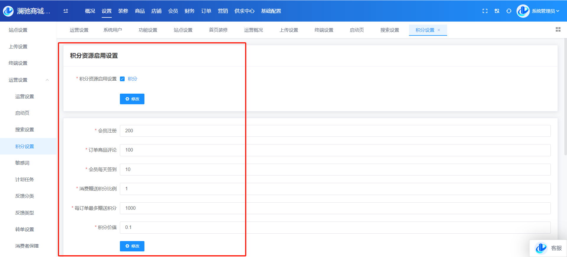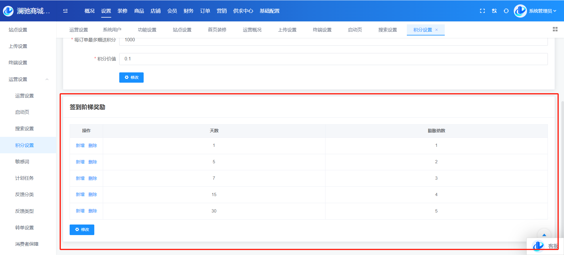 目录 搜索 展开 系统角色说明一、平台管理后台概况设置站点设置上传设置终端设置运营设置运营设置启动页搜索设置积分设置敏感词计划任务反馈分类反馈类型转单设置消费者保障服务财务设置提现设置支付渠道推广设置物流设置快递公司物流查询接口设置互联登录地区设置通知设置消息设置邮件设置短信设置APP推送社交设置IM设置直播设置城市分站微信设置微信设置回复设置菜单设置模板消息SEO设置装修PC装修首页装修页面导航分类导航手机装修首页装修首页导航商品商品管理分类管理品牌管理类型管理规格管理店铺店铺管理供应商管理店铺等级店铺分类入驻协议店铺评价会员会员管理积分管理会员等级注册协议表单数据升级日志用户渠道渠道数据财务会员资金线下支付收款确认订单明细提现管理充值卡管理交易流水-收支明细定额充值提现银行卡订单商品订单退款退货订单评价-店铺评价管理营销活动中心资讯中心分销中心社交种草App发布用户反馈首页弹窗供求中心采购大厅供应大厅基础设置系统用户角色管理安全设置操作日志二、商家管理后台首页订单商品营销资金报表店铺基础售后批发市场三、门店管理后台四、会员(买家)中心PC端个人中心移动端个人中心五、商户入驻流程商城前期准备资料域名备案指南支付宝收款账户开通及配置微信⽀付配置 暂无相关搜索结果! 阅读次数:35 本文档使用 MinDoc 发布 积分设置 积分设置开启积分功能及积分规则设置积分阶梯奖励设置作者:admin 创建时间:2024-08-20 13:05最后编辑:admin 更新时间:2025-12-10 15:34