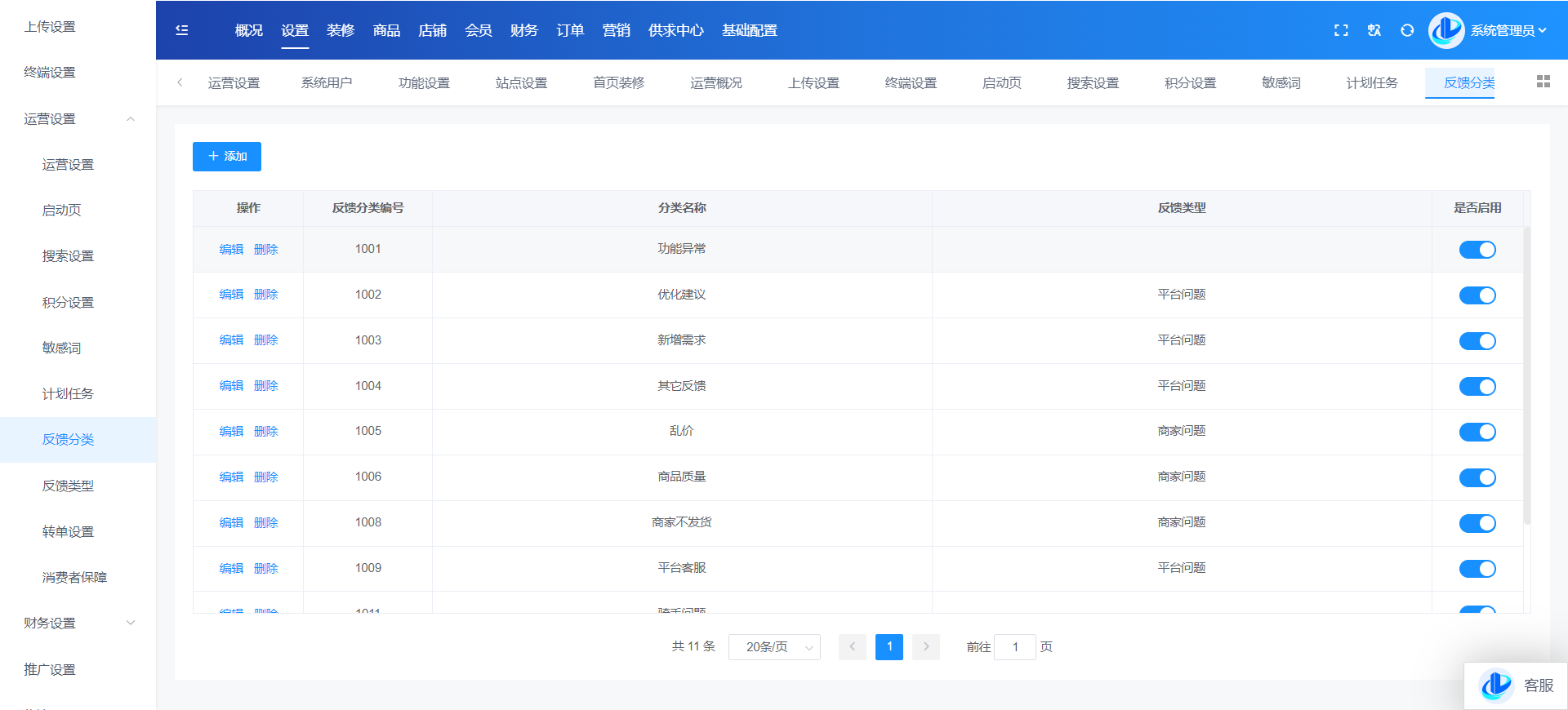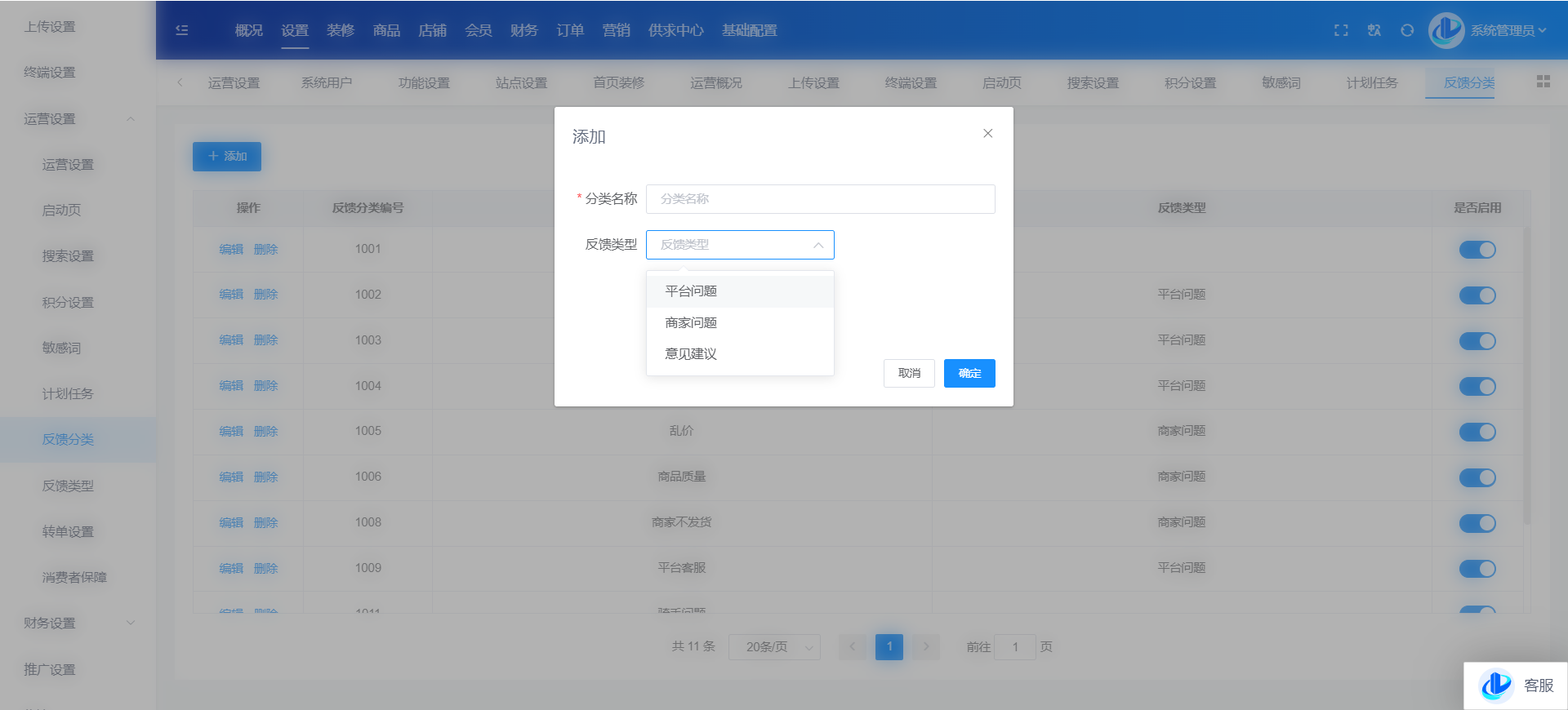 目录 搜索 展开 系统角色说明一、平台管理后台概况设置站点设置上传设置终端设置运营设置运营设置启动页搜索设置积分设置敏感词计划任务反馈分类反馈类型转单设置消费者保障服务财务设置提现设置支付渠道推广设置物流设置快递公司物流查询接口设置互联登录地区设置通知设置消息设置邮件设置短信设置APP推送社交设置IM设置直播设置城市分站微信设置微信设置回复设置菜单设置模板消息SEO设置装修PC装修首页装修页面导航分类导航手机装修首页装修首页导航商品商品管理分类管理品牌管理类型管理规格管理店铺店铺管理供应商管理店铺等级店铺分类入驻协议店铺评价会员会员管理积分管理会员等级注册协议表单数据升级日志用户渠道渠道数据财务会员资金线下支付收款确认订单明细提现管理充值卡管理交易流水-收支明细定额充值提现银行卡订单商品订单退款退货订单评价-店铺评价管理营销活动中心资讯中心分销中心社交种草App发布用户反馈首页弹窗供求中心采购大厅供应大厅基础设置系统用户角色管理安全设置操作日志二、商家管理后台首页订单商品营销资金报表店铺基础售后批发市场三、门店管理后台四、会员(买家)中心PC端个人中心移动端个人中心五、商户入驻流程商城前期准备资料域名备案指南支付宝收款账户开通及配置微信⽀付配置 暂无相关搜索结果! 阅读次数:27 本文档使用 MinDoc 发布 反馈分类 反馈分类对反馈类型进行具体的细化,先添加反馈类型在来这里添加反馈分类添加反馈分类绑定所属对应类型会员可以在个人中心提交反馈作者:admin 创建时间:2024-08-20 13:05最后编辑:admin 更新时间:2025-12-10 15:34