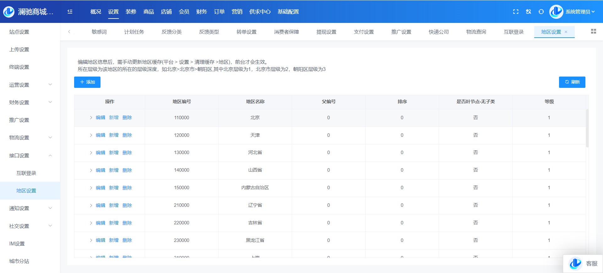 目录 搜索 展开 系统角色说明一、平台管理后台概况设置站点设置上传设置终端设置运营设置运营设置启动页搜索设置积分设置敏感词计划任务反馈分类反馈类型转单设置消费者保障服务财务设置提现设置支付渠道推广设置物流设置快递公司物流查询接口设置互联登录地区设置通知设置消息设置邮件设置短信设置APP推送社交设置IM设置直播设置城市分站微信设置微信设置回复设置菜单设置模板消息SEO设置装修PC装修首页装修页面导航分类导航手机装修首页装修首页导航商品商品管理分类管理品牌管理类型管理规格管理店铺店铺管理供应商管理店铺等级店铺分类入驻协议店铺评价会员会员管理积分管理会员等级注册协议表单数据升级日志用户渠道渠道数据财务会员资金线下支付收款确认订单明细提现管理充值卡管理交易流水-收支明细定额充值提现银行卡订单商品订单退款退货订单评价-店铺评价管理营销活动中心资讯中心分销中心社交种草App发布用户反馈首页弹窗供求中心采购大厅供应大厅基础设置系统用户角色管理安全设置操作日志二、商家管理后台首页订单商品营销资金报表店铺基础售后批发市场三、门店管理后台四、会员(买家)中心PC端个人中心移动端个人中心五、商户入驻流程商城前期准备资料域名备案指南支付宝收款账户开通及配置微信⽀付配置 暂无相关搜索结果! 阅读次数:26 本文档使用 MinDoc 发布 地区设置 地区设置地址库是系统内置好作者:admin 创建时间:2024-08-20 13:05最后编辑:admin 更新时间:2025-12-10 15:34