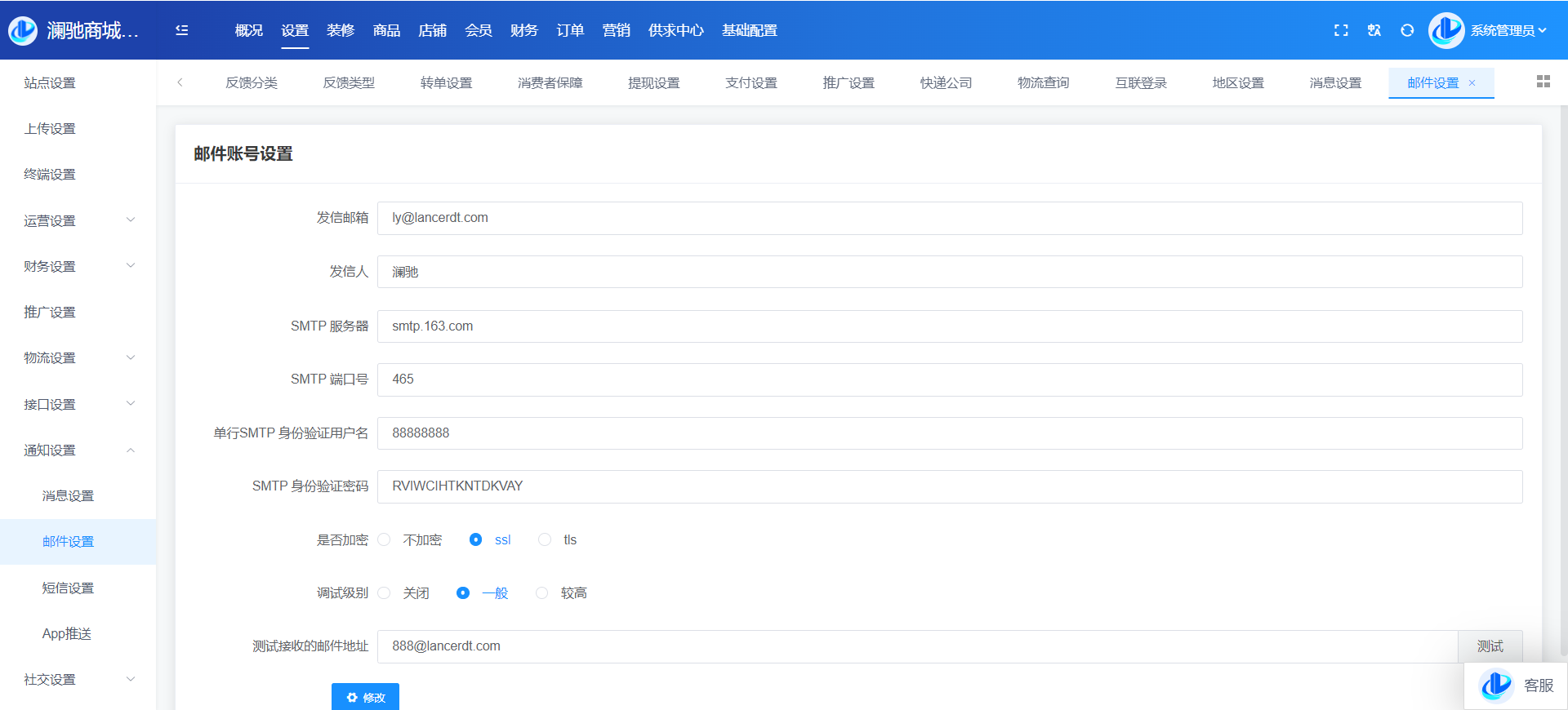 目录 搜索 展开 系统角色说明一、平台管理后台概况设置站点设置上传设置终端设置运营设置运营设置启动页搜索设置积分设置敏感词计划任务反馈分类反馈类型转单设置消费者保障服务财务设置提现设置支付渠道推广设置物流设置快递公司物流查询接口设置互联登录地区设置通知设置消息设置邮件设置短信设置APP推送社交设置IM设置直播设置城市分站微信设置微信设置回复设置菜单设置模板消息SEO设置装修PC装修首页装修页面导航分类导航手机装修首页装修首页导航商品商品管理分类管理品牌管理类型管理规格管理店铺店铺管理供应商管理店铺等级店铺分类入驻协议店铺评价会员会员管理积分管理会员等级注册协议表单数据升级日志用户渠道渠道数据财务会员资金线下支付收款确认订单明细提现管理充值卡管理交易流水-收支明细定额充值提现银行卡订单商品订单退款退货订单评价-店铺评价管理营销活动中心资讯中心分销中心社交种草App发布用户反馈首页弹窗供求中心采购大厅供应大厅基础设置系统用户角色管理安全设置操作日志二、商家管理后台首页订单商品营销资金报表店铺基础售后批发市场三、门店管理后台四、会员(买家)中心PC端个人中心移动端个人中心五、商户入驻流程商城前期准备资料域名备案指南支付宝收款账户开通及配置微信⽀付配置 暂无相关搜索结果! 阅读次数:23 本文档使用 MinDoc 发布 邮件设置 邮件设置邮件设置,系统所有涉及邮件发送的都需要读取此处的配置。作者:admin 创建时间:2024-08-20 13:05最后编辑:admin 更新时间:2025-12-10 15:34