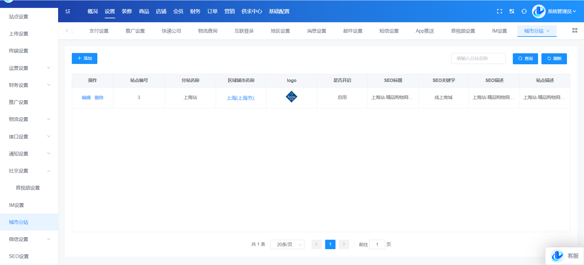 目录 搜索 展开 系统角色说明一、平台管理后台概况设置站点设置上传设置终端设置运营设置运营设置启动页搜索设置积分设置敏感词计划任务反馈分类反馈类型转单设置消费者保障服务财务设置提现设置支付渠道推广设置物流设置快递公司物流查询接口设置互联登录地区设置通知设置消息设置邮件设置短信设置APP推送社交设置IM设置直播设置城市分站微信设置微信设置回复设置菜单设置模板消息SEO设置装修PC装修首页装修页面导航分类导航手机装修首页装修首页导航商品商品管理分类管理品牌管理类型管理规格管理店铺店铺管理供应商管理店铺等级店铺分类入驻协议店铺评价会员会员管理积分管理会员等级注册协议表单数据升级日志用户渠道渠道数据财务会员资金线下支付收款确认订单明细提现管理充值卡管理交易流水-收支明细定额充值提现银行卡订单商品订单退款退货订单评价-店铺评价管理营销活动中心资讯中心分销中心社交种草App发布用户反馈首页弹窗供求中心采购大厅供应大厅基础设置系统用户角色管理安全设置操作日志二、商家管理后台首页订单商品营销资金报表店铺基础售后批发市场三、门店管理后台四、会员(买家)中心PC端个人中心移动端个人中心五、商户入驻流程商城前期准备资料域名备案指南支付宝收款账户开通及配置微信⽀付配置 暂无相关搜索结果! 阅读次数:28 本文档使用 MinDoc 发布 城市分站 城市分站根据区域的不同建立不同的级别城市分站,同时进行管理(需要根据实际情况定制改造)。添加分站并设置分站管理员。作者:admin 创建时间:2024-08-20 13:05最后编辑:admin 更新时间:2025-12-10 15:34