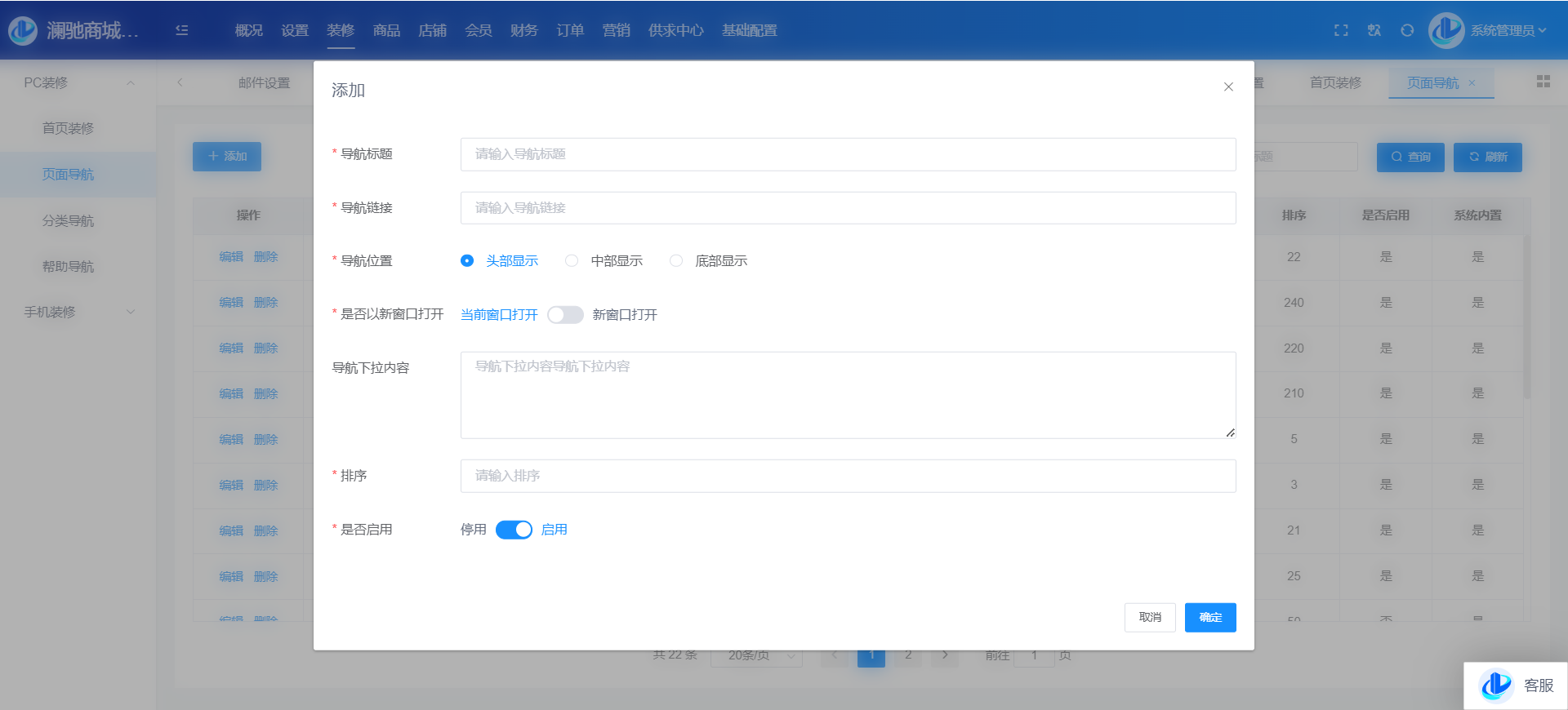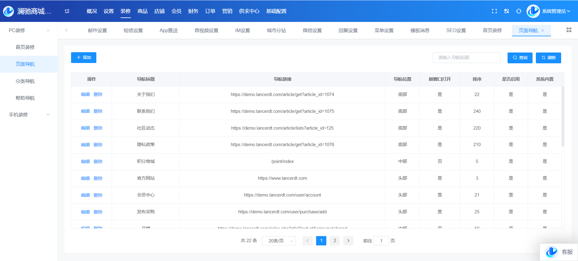 目录 搜索 展开 系统角色说明一、平台管理后台概况设置站点设置上传设置终端设置运营设置运营设置启动页搜索设置积分设置敏感词计划任务反馈分类反馈类型转单设置消费者保障服务财务设置提现设置支付渠道推广设置物流设置快递公司物流查询接口设置互联登录地区设置通知设置消息设置邮件设置短信设置APP推送社交设置IM设置直播设置城市分站微信设置微信设置回复设置菜单设置模板消息SEO设置装修PC装修首页装修页面导航分类导航手机装修首页装修首页导航商品商品管理分类管理品牌管理类型管理规格管理店铺店铺管理供应商管理店铺等级店铺分类入驻协议店铺评价会员会员管理积分管理会员等级注册协议表单数据升级日志用户渠道渠道数据财务会员资金线下支付收款确认订单明细提现管理充值卡管理交易流水-收支明细定额充值提现银行卡订单商品订单退款退货订单评价-店铺评价管理营销活动中心资讯中心分销中心社交种草App发布用户反馈首页弹窗供求中心采购大厅供应大厅基础设置系统用户角色管理安全设置操作日志二、商家管理后台首页订单商品营销资金报表店铺基础售后批发市场三、门店管理后台四、会员(买家)中心PC端个人中心移动端个人中心五、商户入驻流程商城前期准备资料域名备案指南支付宝收款账户开通及配置微信⽀付配置 暂无相关搜索结果! 阅读次数:28 本文档使用 MinDoc 发布 页面导航 页面导航添加导航数据,显示在PC端的头部、中部、底部作者:admin 创建时间:2024-08-20 13:05最后编辑:admin 更新时间:2025-12-10 15:34
