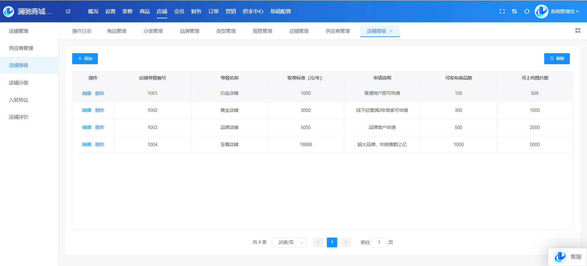 目录 搜索 展开 系统角色说明一、平台管理后台概况设置站点设置上传设置终端设置运营设置运营设置启动页搜索设置积分设置敏感词计划任务反馈分类反馈类型转单设置消费者保障服务财务设置提现设置支付渠道推广设置物流设置快递公司物流查询接口设置互联登录地区设置通知设置消息设置邮件设置短信设置APP推送社交设置IM设置直播设置城市分站微信设置微信设置回复设置菜单设置模板消息SEO设置装修PC装修首页装修页面导航分类导航手机装修首页装修首页导航商品商品管理分类管理品牌管理类型管理规格管理店铺店铺管理供应商管理店铺等级店铺分类入驻协议店铺评价会员会员管理积分管理会员等级注册协议表单数据升级日志用户渠道渠道数据财务会员资金线下支付收款确认订单明细提现管理充值卡管理交易流水-收支明细定额充值提现银行卡订单商品订单退款退货订单评价-店铺评价管理营销活动中心资讯中心分销中心社交种草App发布用户反馈首页弹窗供求中心采购大厅供应大厅基础设置系统用户角色管理安全设置操作日志二、商家管理后台首页订单商品营销资金报表店铺基础售后批发市场三、门店管理后台四、会员(买家)中心PC端个人中心移动端个人中心五、商户入驻流程商城前期准备资料域名备案指南支付宝收款账户开通及配置微信⽀付配置 暂无相关搜索结果! 阅读次数:26 本文档使用 MinDoc 发布 店铺等级 店铺等级设置店铺等级、新增店铺等级作者:admin 创建时间:2024-08-20 13:05最后编辑:admin 更新时间:2025-12-10 15:34