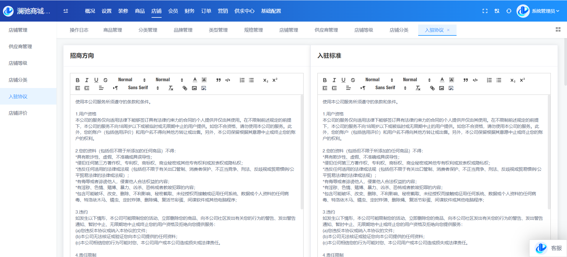目录 搜索 展开 系统角色说明一、平台管理后台概况设置站点设置上传设置终端设置运营设置运营设置启动页搜索设置积分设置敏感词计划任务反馈分类反馈类型转单设置消费者保障服务财务设置提现设置支付渠道推广设置物流设置快递公司物流查询接口设置互联登录地区设置通知设置消息设置邮件设置短信设置APP推送社交设置IM设置直播设置城市分站微信设置微信设置回复设置菜单设置模板消息SEO设置装修PC装修首页装修页面导航分类导航手机装修首页装修首页导航商品商品管理分类管理品牌管理类型管理规格管理店铺店铺管理供应商管理店铺等级店铺分类入驻协议店铺评价会员会员管理积分管理会员等级注册协议表单数据升级日志用户渠道渠道数据财务会员资金线下支付收款确认订单明细提现管理充值卡管理交易流水-收支明细定额充值提现银行卡订单商品订单退款退货订单评价-店铺评价管理营销活动中心资讯中心分销中心社交种草App发布用户反馈首页弹窗供求中心采购大厅供应大厅基础设置系统用户角色管理安全设置操作日志二、商家管理后台首页订单商品营销资金报表店铺基础售后批发市场三、门店管理后台四、会员(买家)中心PC端个人中心移动端个人中心五、商户入驻流程商城前期准备资料域名备案指南支付宝收款账户开通及配置微信⽀付配置 暂无相关搜索结果! 阅读次数:25 本文档使用 MinDoc 发布 入驻协议 入驻协议店铺入驻协议相关内容的维护作者:admin 创建时间:2024-08-20 13:05最后编辑:admin 更新时间:2025-12-10 15:34