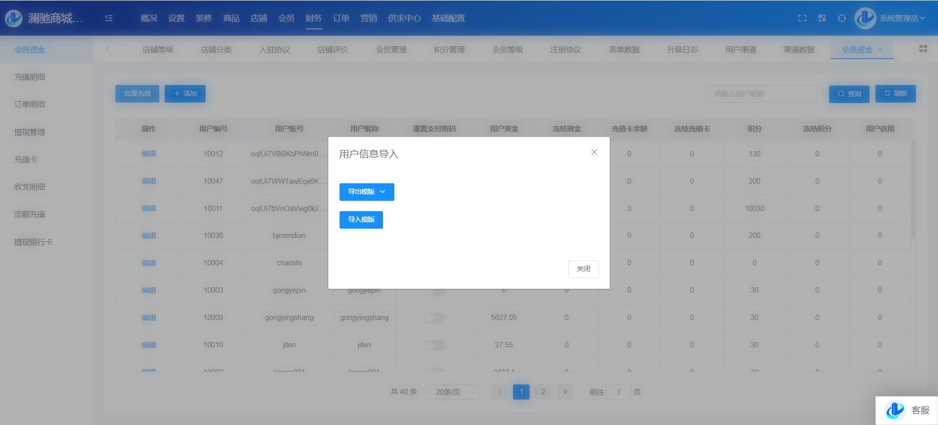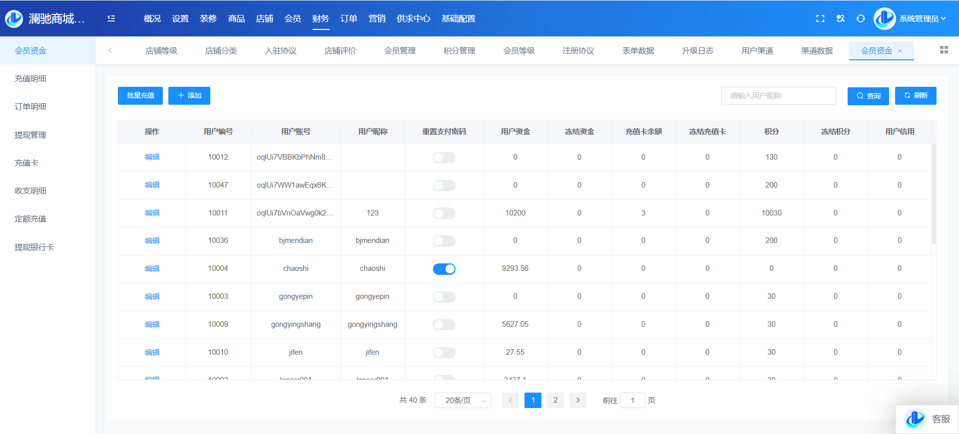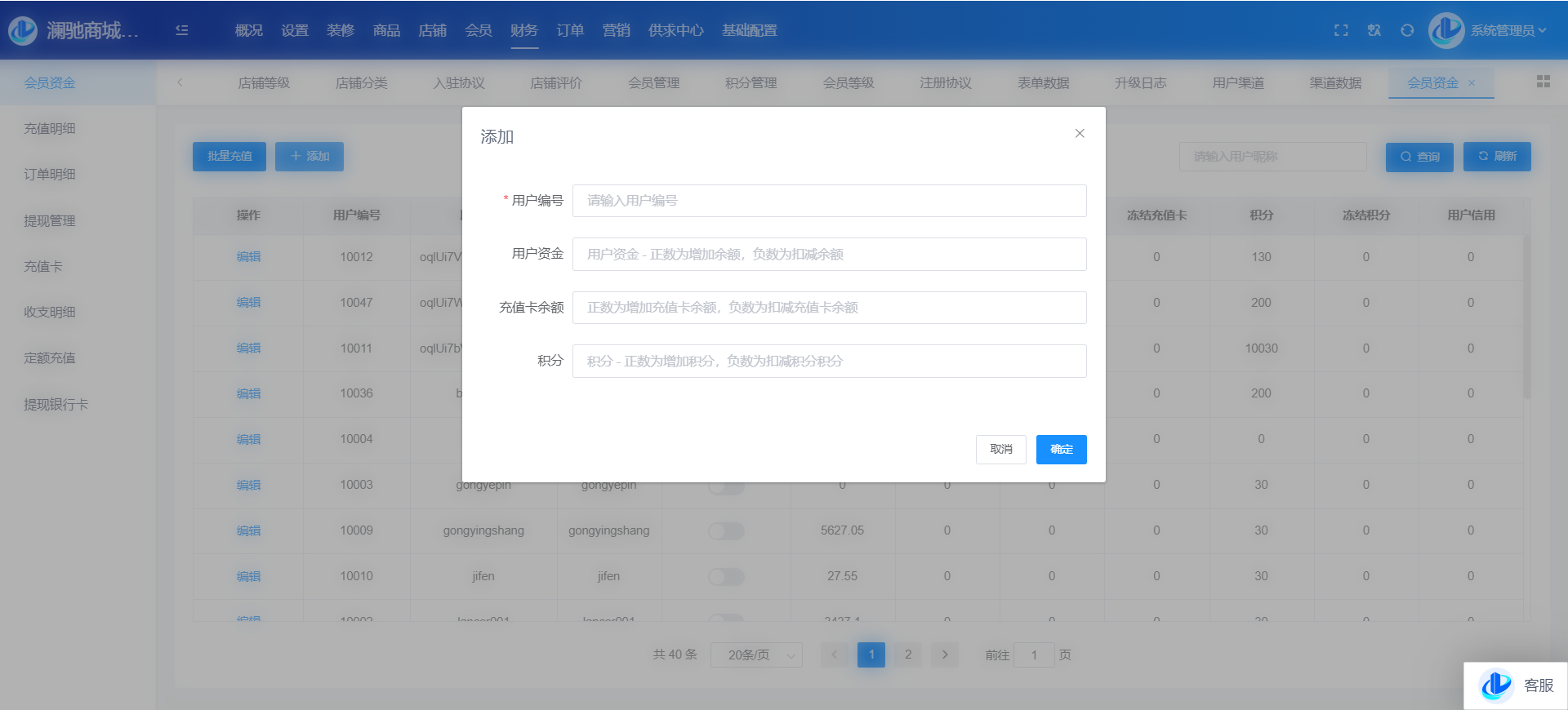 目录 搜索 展开 系统角色说明一、平台管理后台概况设置站点设置上传设置终端设置运营设置运营设置启动页搜索设置积分设置敏感词计划任务反馈分类反馈类型转单设置消费者保障服务财务设置提现设置支付渠道推广设置物流设置快递公司物流查询接口设置互联登录地区设置通知设置消息设置邮件设置短信设置APP推送社交设置IM设置直播设置城市分站微信设置微信设置回复设置菜单设置模板消息SEO设置装修PC装修首页装修页面导航分类导航手机装修首页装修首页导航商品商品管理分类管理品牌管理类型管理规格管理店铺店铺管理供应商管理店铺等级店铺分类入驻协议店铺评价会员会员管理积分管理会员等级注册协议表单数据升级日志用户渠道渠道数据财务会员资金线下支付收款确认订单明细提现管理充值卡管理交易流水-收支明细定额充值提现银行卡订单商品订单退款退货订单评价-店铺评价管理营销活动中心资讯中心分销中心社交种草App发布用户反馈首页弹窗供求中心采购大厅供应大厅基础设置系统用户角色管理安全设置操作日志二、商家管理后台首页订单商品营销资金报表店铺基础售后批发市场三、门店管理后台四、会员(买家)中心PC端个人中心移动端个人中心五、商户入驻流程商城前期准备资料域名备案指南支付宝收款账户开通及配置微信⽀付配置 暂无相关搜索结果! 阅读次数:25 本文档使用 MinDoc 发布 会员资金 会员资金查看会员帐户资金明细,可以给会员批量充值;可以给会员增加或减少积分作者:admin 创建时间:2024-08-20 13:05最后编辑:admin 更新时间:2025-12-10 15:34