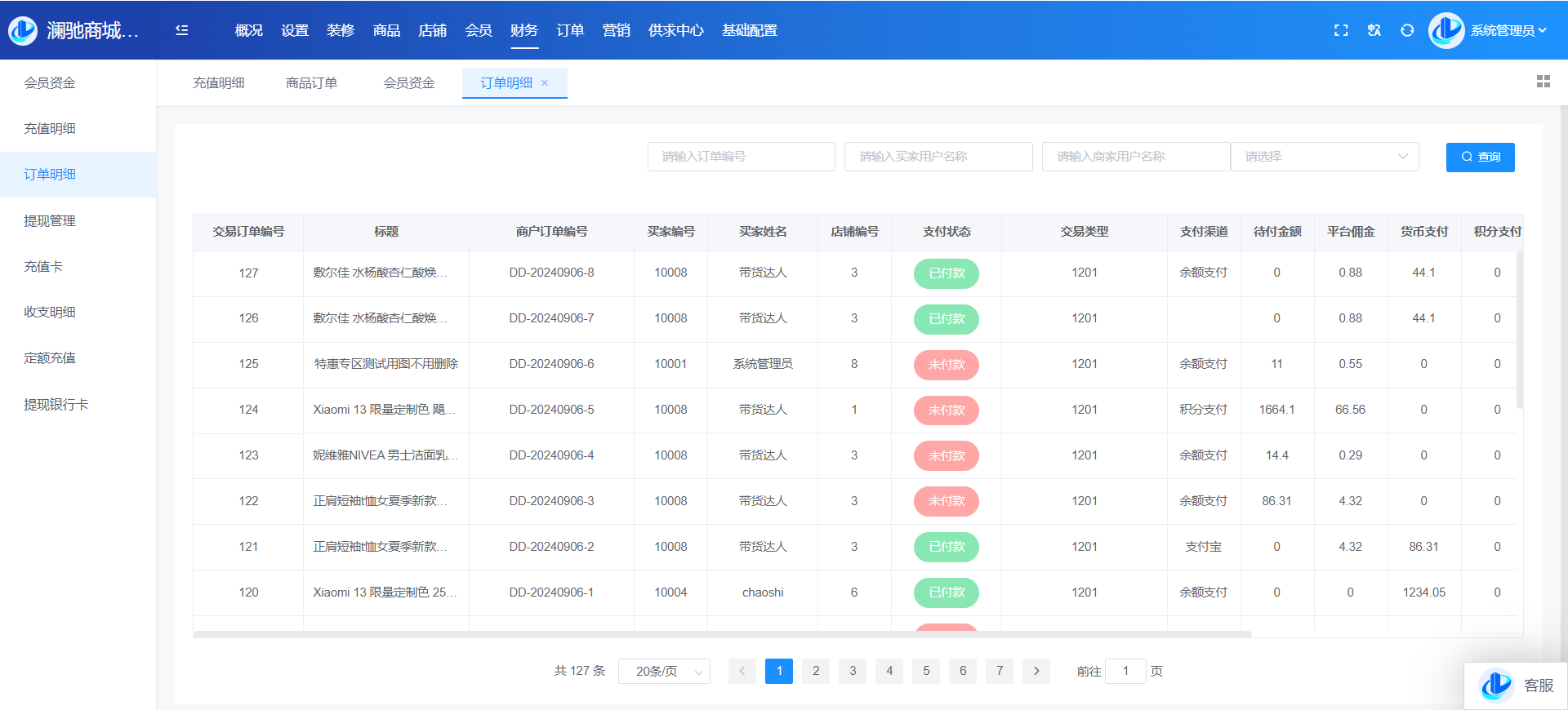 目录 搜索 展开 系统角色说明一、平台管理后台概况设置站点设置上传设置终端设置运营设置运营设置启动页搜索设置积分设置敏感词计划任务反馈分类反馈类型转单设置消费者保障服务财务设置提现设置支付渠道推广设置物流设置快递公司物流查询接口设置互联登录地区设置通知设置消息设置邮件设置短信设置APP推送社交设置IM设置直播设置城市分站微信设置微信设置回复设置菜单设置模板消息SEO设置装修PC装修首页装修页面导航分类导航手机装修首页装修首页导航商品商品管理分类管理品牌管理类型管理规格管理店铺店铺管理供应商管理店铺等级店铺分类入驻协议店铺评价会员会员管理积分管理会员等级注册协议表单数据升级日志用户渠道渠道数据财务会员资金线下支付收款确认订单明细提现管理充值卡管理交易流水-收支明细定额充值提现银行卡订单商品订单退款退货订单评价-店铺评价管理营销活动中心资讯中心分销中心社交种草App发布用户反馈首页弹窗供求中心采购大厅供应大厅基础设置系统用户角色管理安全设置操作日志二、商家管理后台首页订单商品营销资金报表店铺基础售后批发市场三、门店管理后台四、会员(买家)中心PC端个人中心移动端个人中心五、商户入驻流程商城前期准备资料域名备案指南支付宝收款账户开通及配置微信⽀付配置 暂无相关搜索结果! 阅读次数:26 本文档使用 MinDoc 发布 订单明细 订单明细-订单收款统计所有的订单的明细流水 各种状态显示商品名称订单号买家店铺支付状态订单金额平台佣金订单生成时间作者:admin 创建时间:2024-08-20 13:05最后编辑:admin 更新时间:2025-12-10 15:34