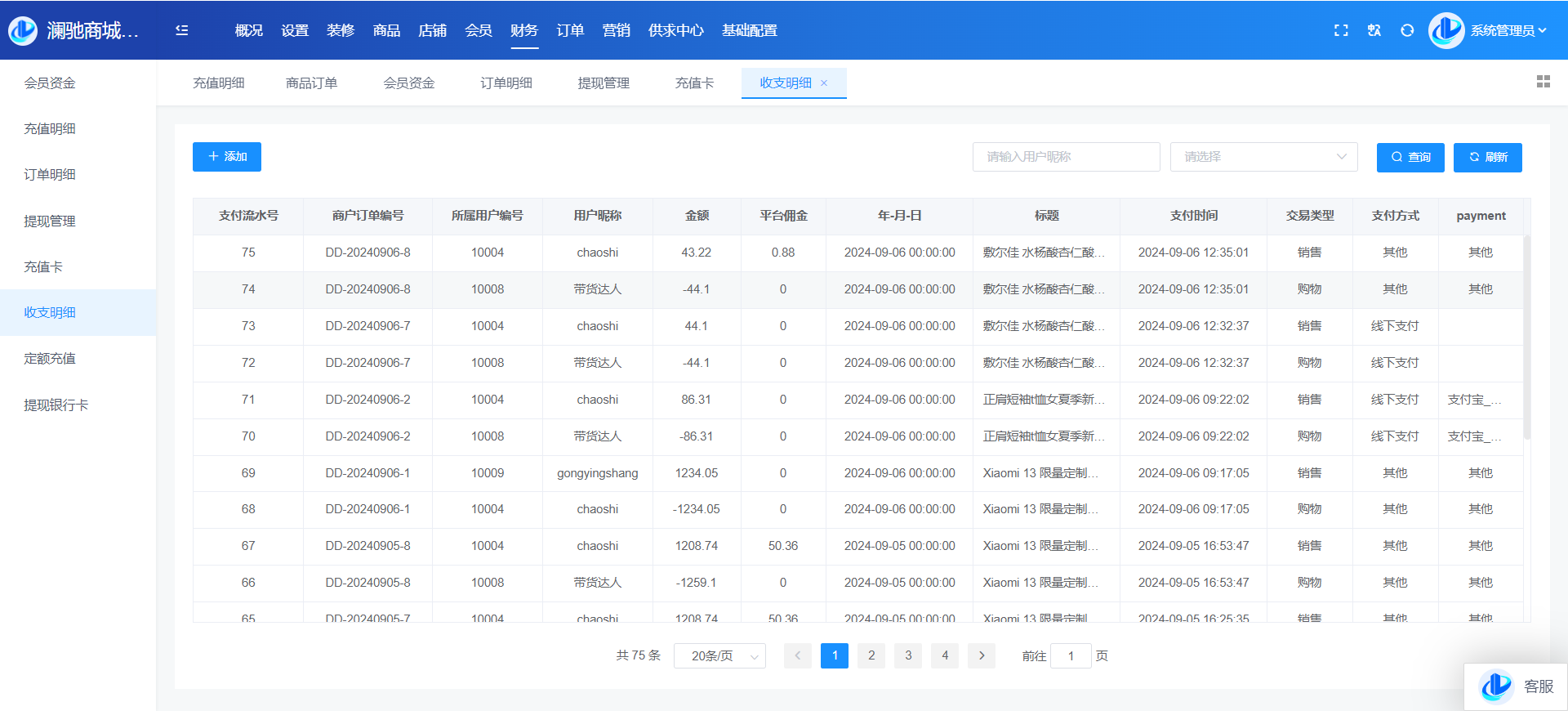 目录 搜索 展开 系统角色说明一、平台管理后台概况设置站点设置上传设置终端设置运营设置运营设置启动页搜索设置积分设置敏感词计划任务反馈分类反馈类型转单设置消费者保障服务财务设置提现设置支付渠道推广设置物流设置快递公司物流查询接口设置互联登录地区设置通知设置消息设置邮件设置短信设置APP推送社交设置IM设置直播设置城市分站微信设置微信设置回复设置菜单设置模板消息SEO设置装修PC装修首页装修页面导航分类导航手机装修首页装修首页导航商品商品管理分类管理品牌管理类型管理规格管理店铺店铺管理供应商管理店铺等级店铺分类入驻协议店铺评价会员会员管理积分管理会员等级注册协议表单数据升级日志用户渠道渠道数据财务会员资金线下支付收款确认订单明细提现管理充值卡管理交易流水-收支明细定额充值提现银行卡订单商品订单退款退货订单评价-店铺评价管理营销活动中心资讯中心分销中心社交种草App发布用户反馈首页弹窗供求中心采购大厅供应大厅基础设置系统用户角色管理安全设置操作日志二、商家管理后台首页订单商品营销资金报表店铺基础售后批发市场三、门店管理后台四、会员(买家)中心PC端个人中心移动端个人中心五、商户入驻流程商城前期准备资料域名备案指南支付宝收款账户开通及配置微信⽀付配置 暂无相关搜索结果! 阅读次数:21 本文档使用 MinDoc 发布 交易流水-收支明细 交易流水-收支明细所有的交易流水展示这里的信息显示的是平台上所有的交易流水,销售,购买,充值等。作者:admin 创建时间:2024-08-20 13:05最后编辑:admin 更新时间:2025-12-10 15:34