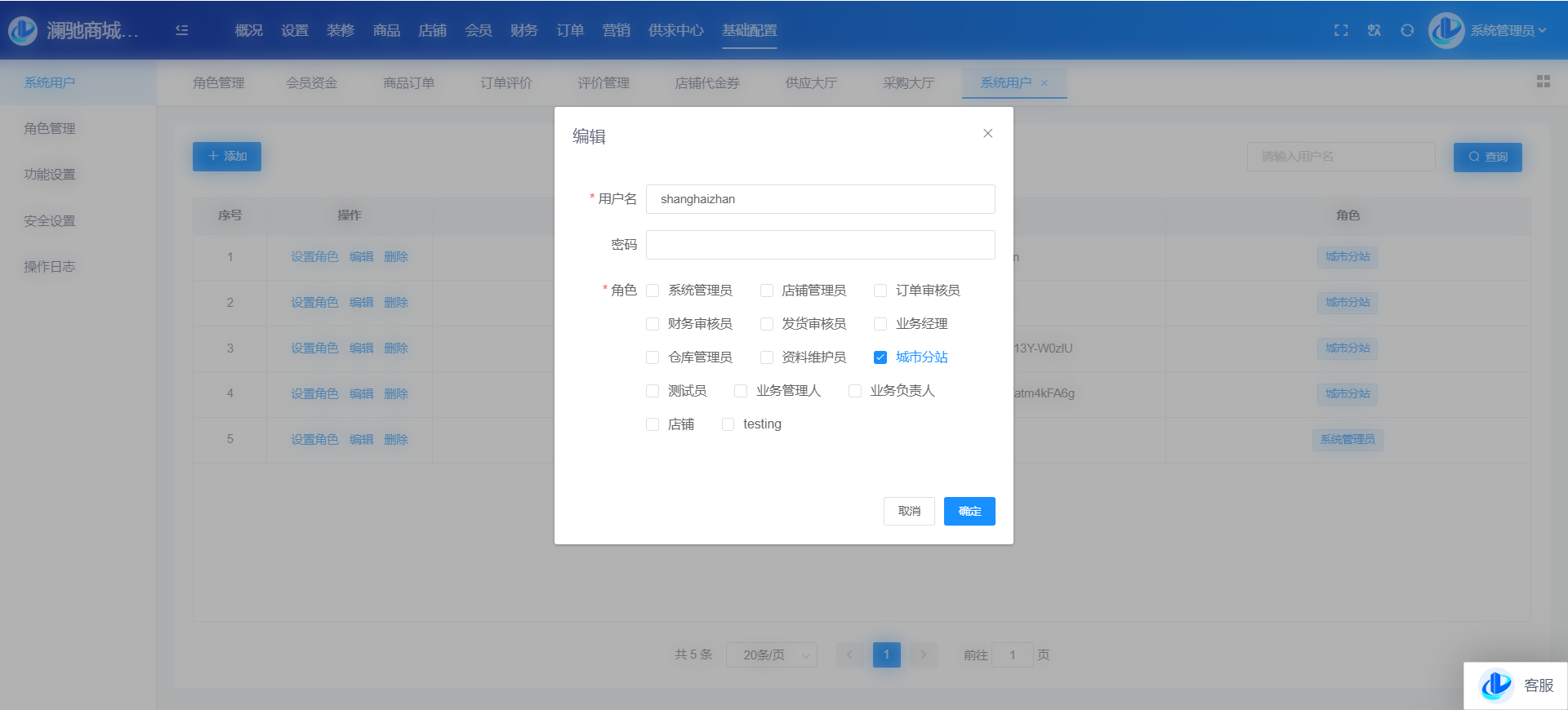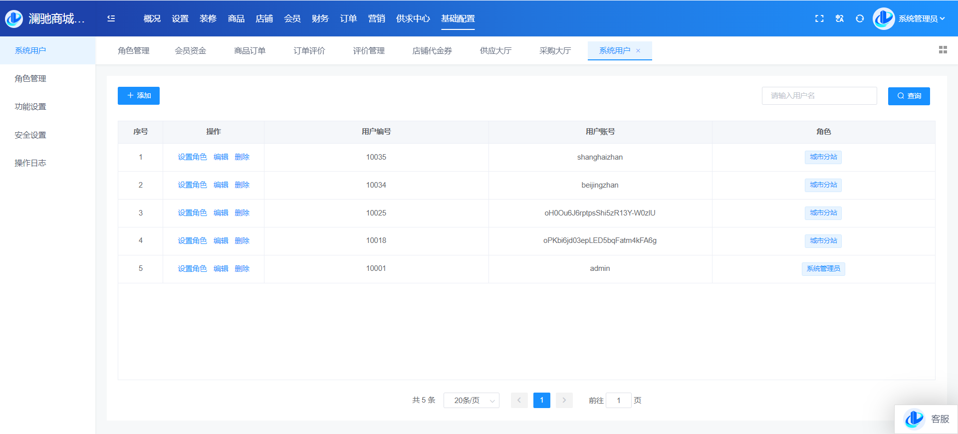 目录 搜索 展开 系统角色说明一、平台管理后台概况设置站点设置上传设置终端设置运营设置运营设置启动页搜索设置积分设置敏感词计划任务反馈分类反馈类型转单设置消费者保障服务财务设置提现设置支付渠道推广设置物流设置快递公司物流查询接口设置互联登录地区设置通知设置消息设置邮件设置短信设置APP推送社交设置IM设置直播设置城市分站微信设置微信设置回复设置菜单设置模板消息SEO设置装修PC装修首页装修页面导航分类导航手机装修首页装修首页导航商品商品管理分类管理品牌管理类型管理规格管理店铺店铺管理供应商管理店铺等级店铺分类入驻协议店铺评价会员会员管理积分管理会员等级注册协议表单数据升级日志用户渠道渠道数据财务会员资金线下支付收款确认订单明细提现管理充值卡管理交易流水-收支明细定额充值提现银行卡订单商品订单退款退货订单评价-店铺评价管理营销活动中心资讯中心分销中心社交种草App发布用户反馈首页弹窗供求中心采购大厅供应大厅基础设置系统用户角色管理安全设置操作日志二、商家管理后台首页订单商品营销资金报表店铺基础售后批发市场三、门店管理后台四、会员(买家)中心PC端个人中心移动端个人中心五、商户入驻流程商城前期准备资料域名备案指南支付宝收款账户开通及配置微信⽀付配置 暂无相关搜索结果! 阅读次数:18 本文档使用 MinDoc 发布 系统用户 用户管理添加管理员账号,然后设置对应的角色,即可拥有对应角色的权限作者:admin 创建时间:2024-08-20 13:05最后编辑:admin 更新时间:2025-12-10 15:34