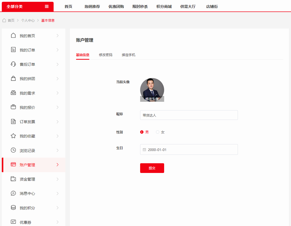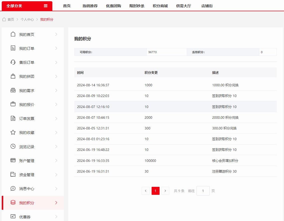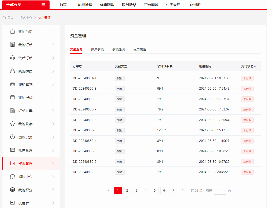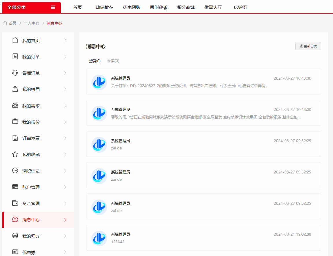 目录 搜索 展开 系统角色说明一、平台管理后台概况设置站点设置上传设置终端设置运营设置运营设置启动页搜索设置积分设置敏感词计划任务反馈分类反馈类型转单设置消费者保障服务财务设置提现设置支付渠道推广设置物流设置快递公司物流查询接口设置互联登录地区设置通知设置消息设置邮件设置短信设置APP推送社交设置IM设置直播设置城市分站微信设置微信设置回复设置菜单设置模板消息SEO设置装修PC装修首页装修页面导航分类导航手机装修首页装修首页导航商品商品管理分类管理品牌管理类型管理规格管理店铺店铺管理供应商管理店铺等级店铺分类入驻协议店铺评价会员会员管理积分管理会员等级注册协议表单数据升级日志用户渠道渠道数据财务会员资金线下支付收款确认订单明细提现管理充值卡管理交易流水-收支明细定额充值提现银行卡订单商品订单退款退货订单评价-店铺评价管理营销活动中心资讯中心分销中心社交种草App发布用户反馈首页弹窗供求中心采购大厅供应大厅基础设置系统用户角色管理安全设置操作日志二、商家管理后台首页订单商品营销资金报表店铺基础售后批发市场三、门店管理后台四、会员(买家)中心PC端个人中心移动端个人中心五、商户入驻流程商城前期准备资料域名备案指南支付宝收款账户开通及配置微信⽀付配置 暂无相关搜索结果! 阅读次数:38 本文档使用 MinDoc 发布 PC端个人中心 PC端个人中心我的首页我的订单售后订单我的拼团我的需求发布需求我的报价订单发票我的收藏我的足迹账户管理资金管理消息中心我的积分优惠券意见反馈平台客服作者:admin 创建时间:2024-09-03 14:41最后编辑:admin 更新时间:2025-12-10 15:34