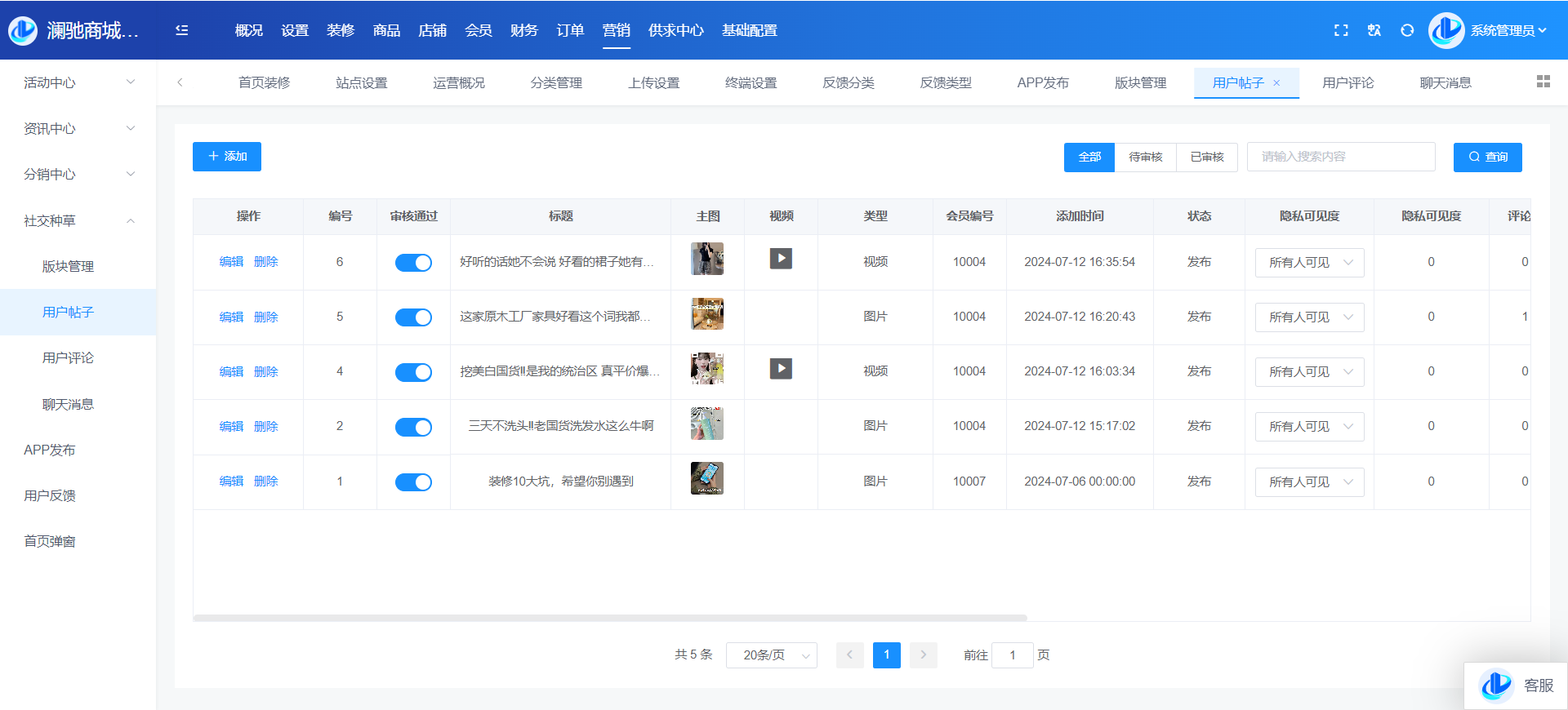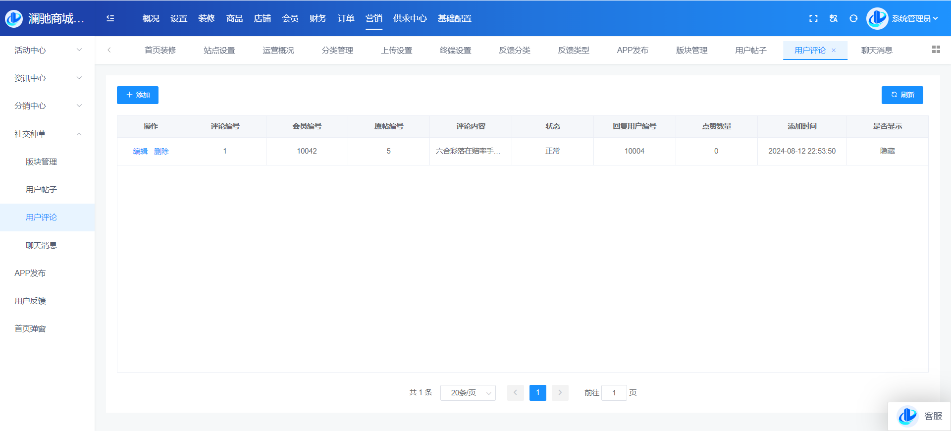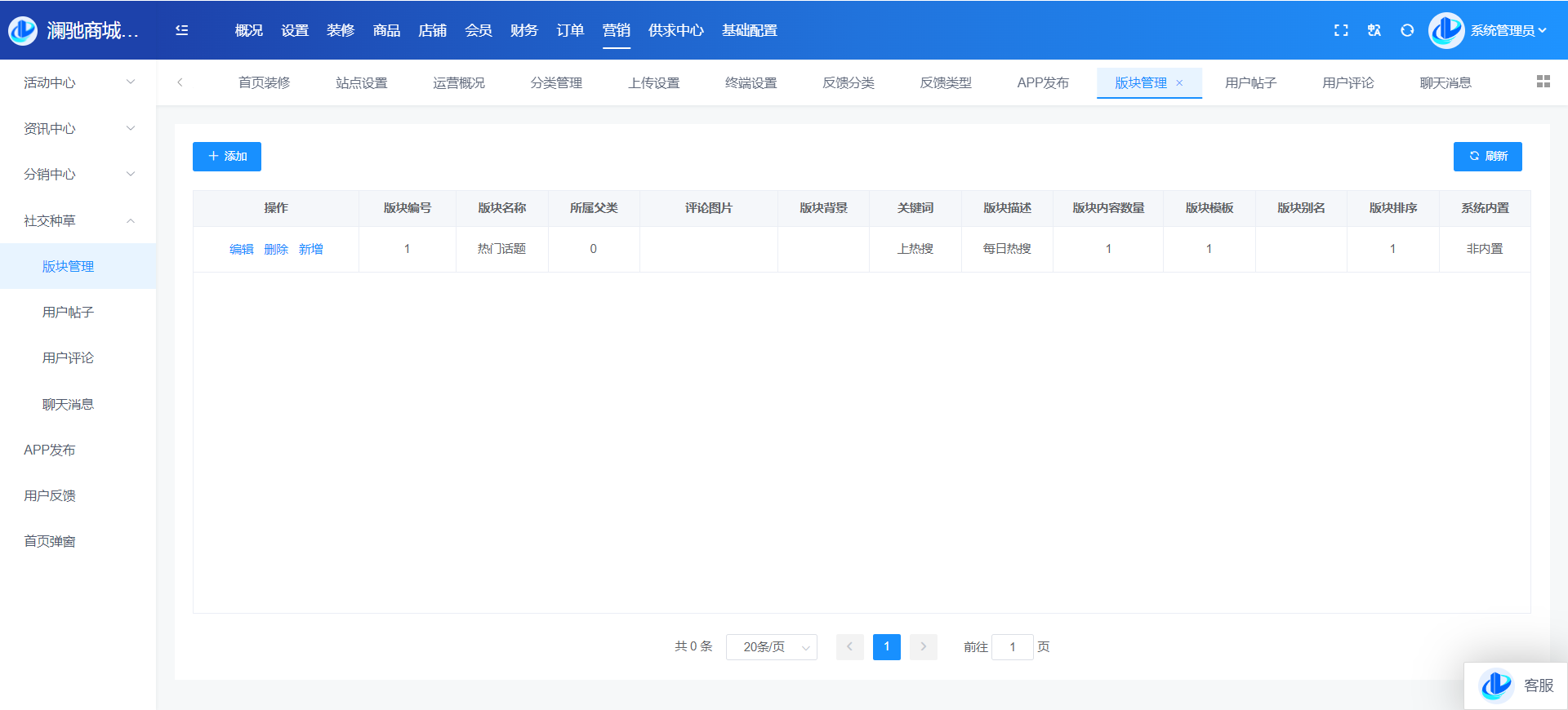 目录 搜索 展开 系统角色说明一、平台管理后台概况设置站点设置上传设置终端设置运营设置运营设置启动页搜索设置积分设置敏感词计划任务反馈分类反馈类型转单设置消费者保障服务财务设置提现设置支付渠道推广设置物流设置快递公司物流查询接口设置互联登录地区设置通知设置消息设置邮件设置短信设置APP推送社交设置IM设置直播设置城市分站微信设置微信设置回复设置菜单设置模板消息SEO设置装修PC装修首页装修页面导航分类导航手机装修首页装修首页导航商品商品管理分类管理品牌管理类型管理规格管理店铺店铺管理供应商管理店铺等级店铺分类入驻协议店铺评价会员会员管理积分管理会员等级注册协议表单数据升级日志用户渠道渠道数据财务会员资金线下支付收款确认订单明细提现管理充值卡管理交易流水-收支明细定额充值提现银行卡订单商品订单退款退货订单评价-店铺评价管理营销活动中心资讯中心分销中心社交种草App发布用户反馈首页弹窗供求中心采购大厅供应大厅基础设置系统用户角色管理安全设置操作日志二、商家管理后台首页订单商品营销资金报表店铺基础售后批发市场三、门店管理后台四、会员(买家)中心PC端个人中心移动端个人中心五、商户入驻流程商城前期准备资料域名备案指南支付宝收款账户开通及配置微信⽀付配置 暂无相关搜索结果! 阅读次数:13 本文档使用 MinDoc 发布 社交种草 社交种草板块管理维护板块数据,发布帖子时可以选择对应板块用户帖子用户发布的帖子列表,可以编辑、审核、设置可见度、删除等操作用户评论用户对帖子的评论内容展示,支持删除和设置隐藏作者:admin 创建时间:2024-09-06 13:54最后编辑:admin 更新时间:2025-12-10 15:34